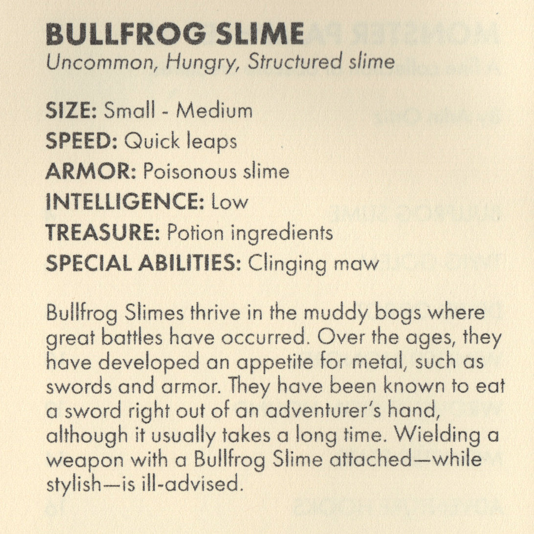 A Risograph-printed art zine that features five strange and absurd monsters. Each monster includes an illustration and a short description inspired by old tabletop roleplaying games.